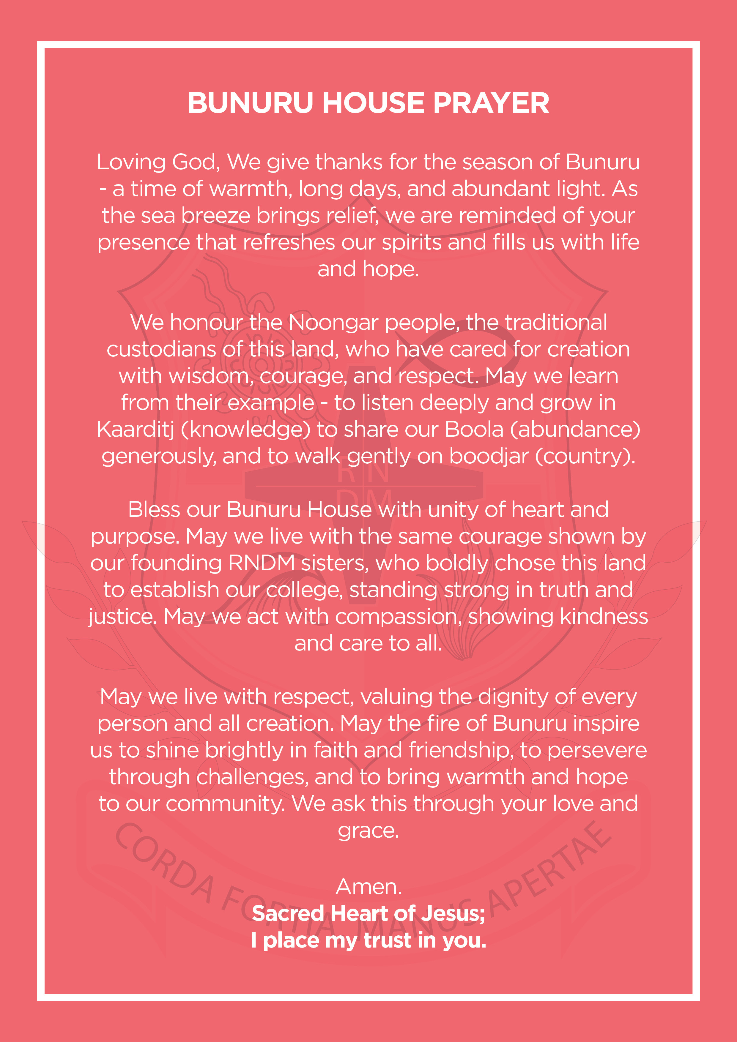 Each House is deeply connected and reflective of an important chapter of the College's rich history and the Charism and spirituality of the RNDM Sisters. House identity is illustrated in each House's motto, prayer and charity fundraising, as well as the crest and our marvellous and mischievous House mascots. Additionally, each House's First Nations Totem serves to guide student stewardship and responsibility to conserve local environment and protect native fauna and flora.