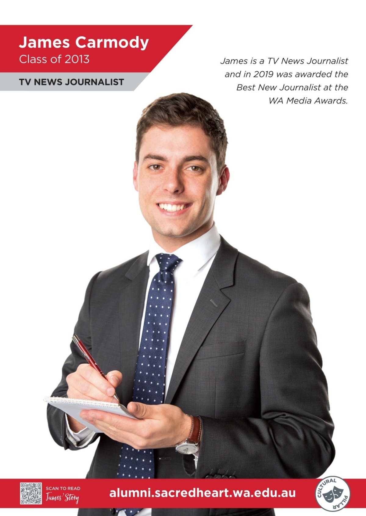 After graduating from Sacred Heart, James studied Journalism at university while also writing and presenting news at a community radio station. His hard work paid off when he secured a role as a TV News Reporter with Channel 10. He later joined the ABC and then 7 News, where he has reported across radio, online and television, travelling the state, nation and world to cover everything from bushfires and cyclones to crime and politics.