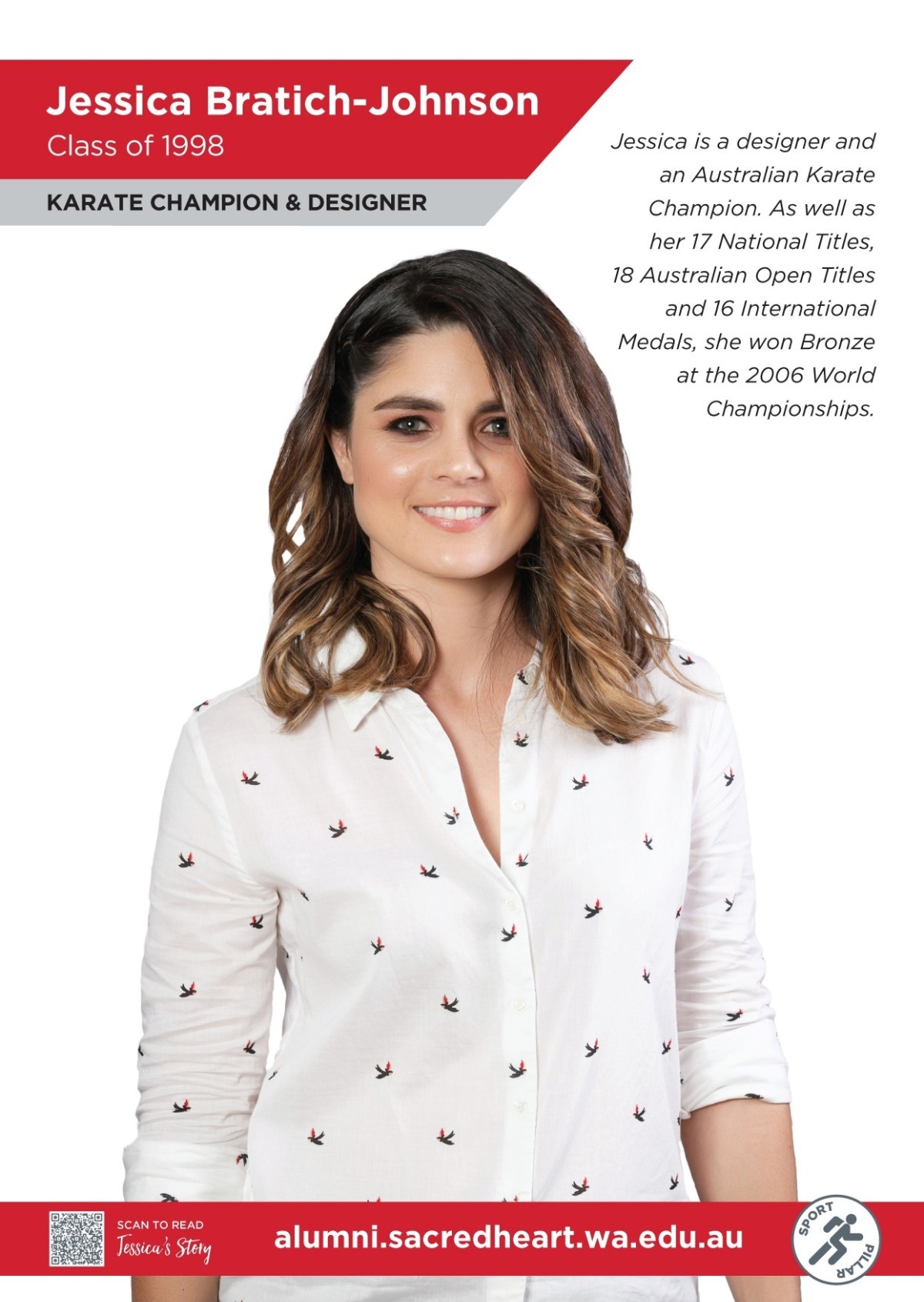 Before she became known for her accessories label 'Jessica Bratich', Jessica was a world-class athlete. Coached by her father Branco, she won her first National Gold Medal in Kumite at just 13 years old. During her time at Sacred Heart, she balanced schoolwork with competing on the national and world stage, ultimately earning 17 National Titles, 18 Australian Open Titles and 16 International medals - including a Bronze at the 2006 World Championships in Finland.